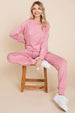 This lounge set includes a stylish round neck raglan sleeve top and coordinating drawstring pants. The top features a classic round neckline and trendy raglan sleeves, while the drawstring pants offer a comfortable and adjustable fit. This set is perfect for relaxing at home or running errands in style.